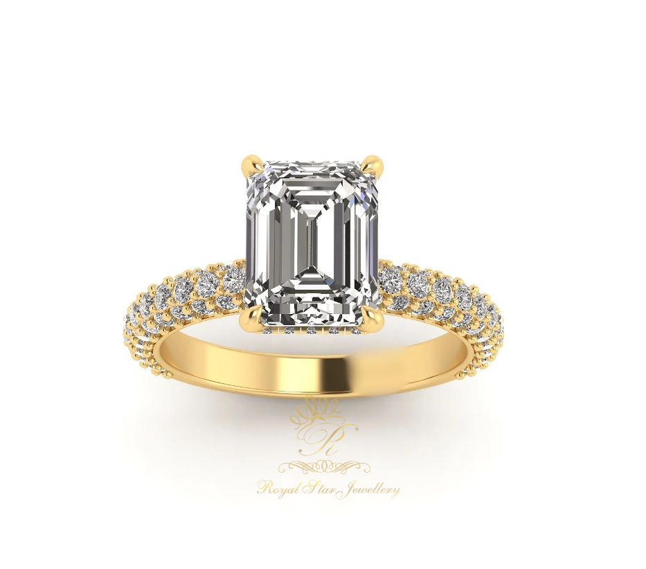 Stunning solitaire engagement ring, Inspired by the beauty of new shapes with bold volumes. The Emerald Pave Ring makes a strong statement in your everyday life. This beautiful piece features a three Row Micro Pave band encrusted with fine round cuts of diamonds and an emerald centerpiece of the same stone.